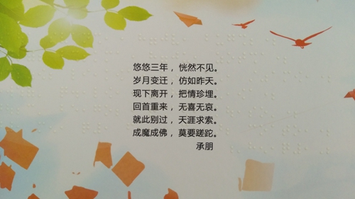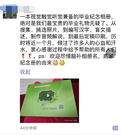 感謝所有為“盲文畢業(yè)紀(jì)念冊(cè)”做出奉獻(xiàn)的人,因?yàn)槟銈?,世界更美麗。掃描封面二維碼,聆聽(tīng)2018屆貳家畢業(yè)班同學(xué)的校園故事,不知不覺(jué),熱淚盈眶,感動(dòng)之余,我明白了“讓印刷走進(jìn)千家萬(wàn)戶,為幸福生活添色加彩”的真實(shí)含義。