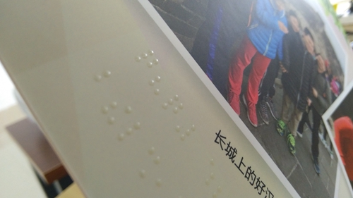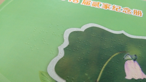一個(gè)架子上,放著一疊厚實(shí)的精裝冊(cè)子,封面寫(xiě)著“2018屆貳家紀(jì)念冊(cè)”。翻開(kāi)冊(cè)子,與以往見(jiàn)到的一樣,紙面印著一張張燦爛而純真的笑臉和一些文字,不一樣的是,紙面上還多了一些微微凸起圓點(diǎn),大約厚度1mm左右,按一種特有的規(guī)律排列,看起來(lái)晶瑩剔透,用手撫摸一下,顆粒感很真實(shí),這就是“盲文畢業(yè)紀(jì)念冊(cè)”。