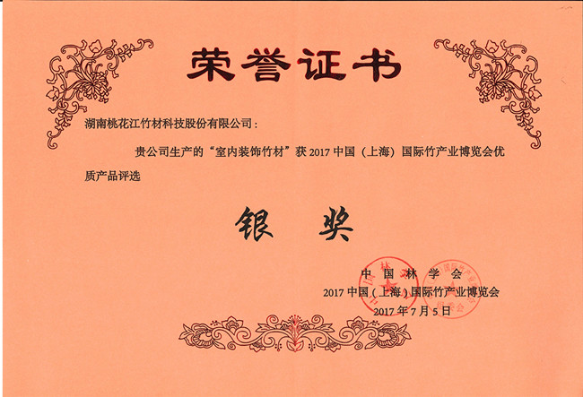 2017年7月,在中國(guó)(上海)國(guó)際竹產(chǎn)業(yè)博覽會(huì)產(chǎn)品評(píng)選中湖南桃花江竹材科技的室內(nèi)裝飾竹材榮獲銀獎(jiǎng)。該榮譽(yù)是對(duì)桃花江竹材科技的高度認(rèn)可,桃花江生產(chǎn)的室內(nèi)裝飾竹材取之天然,綠色環(huán)保,古樸自然,是有文化底蘊(yùn)的室內(nèi)裝修裝飾材料,是木材的理想替代品。