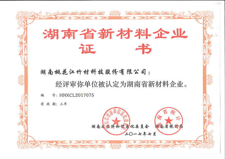 2017年7月,湖南省經(jīng)濟和信息化委員會、湖南省統(tǒng)計局為湖南桃花江竹材科技股份有限公司正式頒發(fā)“湖南省新材料企業(yè)”證書(證書編號:HNXCL2017075)。湖南省新材料企業(yè)的認定,標志著湖南桃花江竹材科技在新型竹材領(lǐng)域的成績得到國家認可與支持,是一項極具含金量的突破性榮譽。作為中國竹業(yè)龍頭企業(yè),湖南桃花江竹材科技一直走在新型竹材研發(fā)、運用和推廣的前沿,為全球竹產(chǎn)業(yè)的發(fā)展持續(xù)貢獻力量。