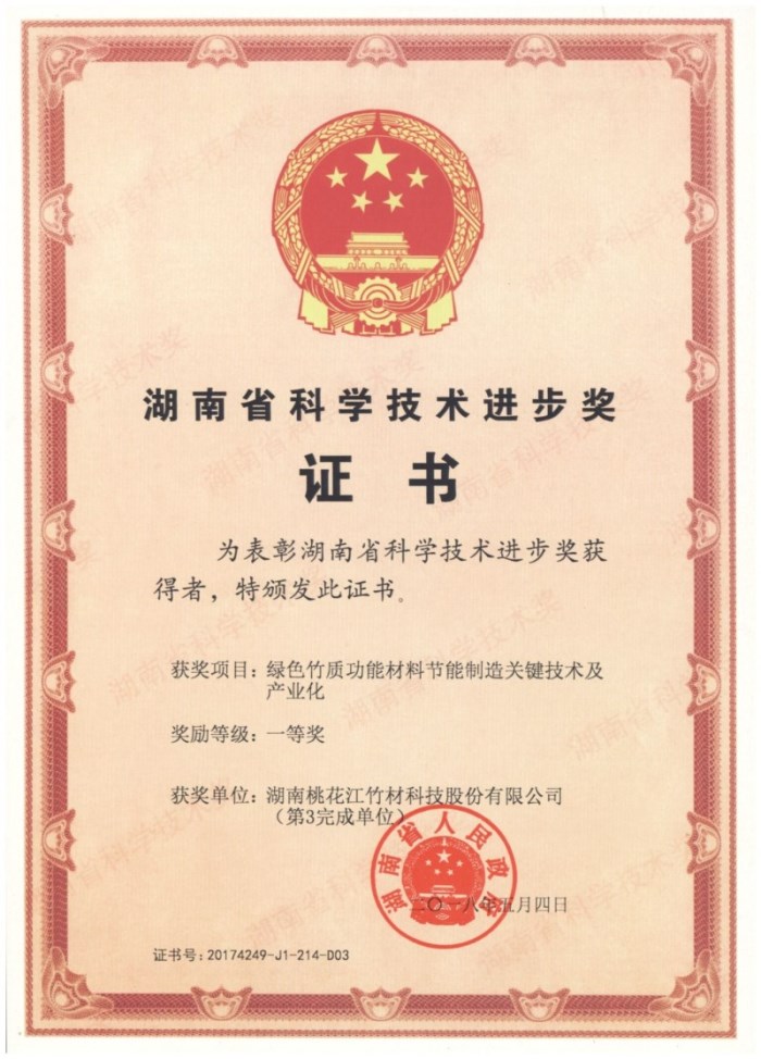 其中, 湖南桃花江竹材科技股份有限公司的綠色竹質(zhì)功能材料節(jié)能制造關(guān)鍵技術(shù)及產(chǎn)業(yè)化項(xiàng)目榮獲2017年湖南省科學(xué)技術(shù)進(jìn)步一等獎。